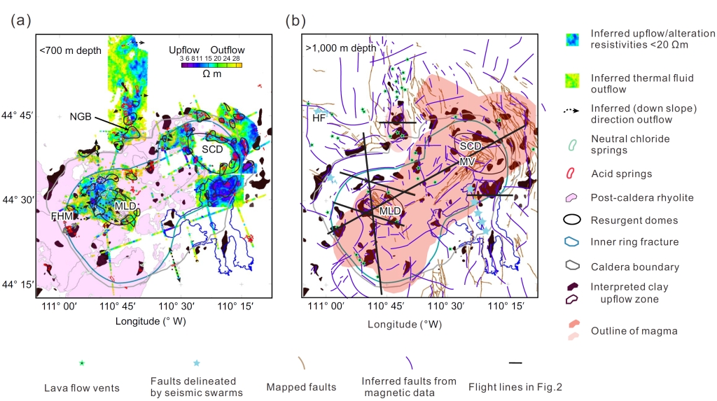 (4)中央破火山口中少数线性排列的低磁化率区域可能与破火山口南北区域的断裂相连。尽管存在广泛的断层和熔岩流喷口,但NGB(Norris Geyser Basin) 以北的低磁化率区域减少,这可能是由于较低的温度不足以产生粘土蚀变。粘土分布、断裂和热液区域的这种分布关系显著受岩浆热源的影响。裂隙/断裂和流体对形成地表地热特征是必需的。一些低磁化率区域可能与埋藏或古热液系统有关,特别是那些与现代热区无关且距现代岩浆体较远(> 5?km)的系统。