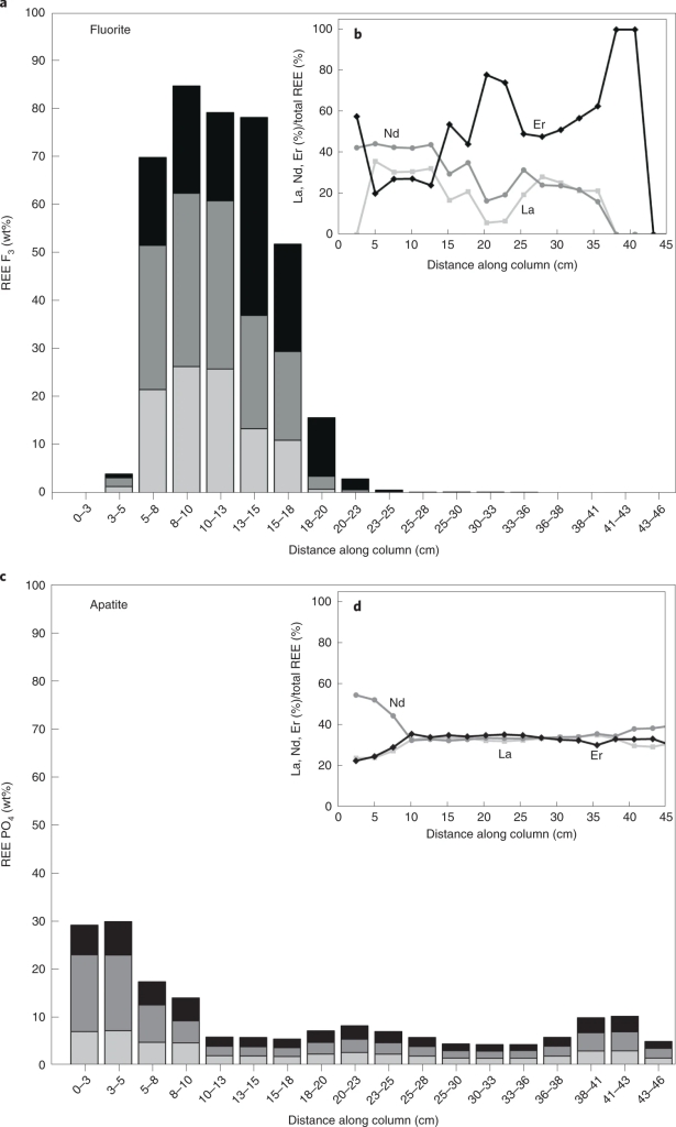 模拟实验采用的初始流体含2 wt.% NaCl,~400 ppm 轻稀土La,~500 ppm中稀土Nd,~500 ppm 重稀土Er,流体温度为250 ℃,pH = 2。实验过程中,使上述流体分别流经含磷灰石(含稀土沉淀剂P)、萤石(含稀土沉淀剂F)、以及磷灰石+萤石混合物的反应釜。结果显示: