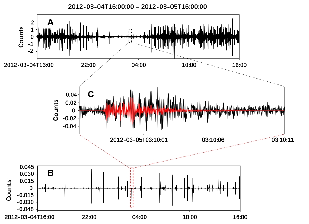 图1 原始地震记录与去噪地震记录对比(Yang et al., 2022)。(A)为原始地震记录(24小时),(B)为相应的去噪地震记录,(C)为(A)中虚线框所示的一个地震信号(黑色)和其去噪后的波形(红色)。去噪方法能够有效的还原地震信号,且在体波部分基本不产生畸变