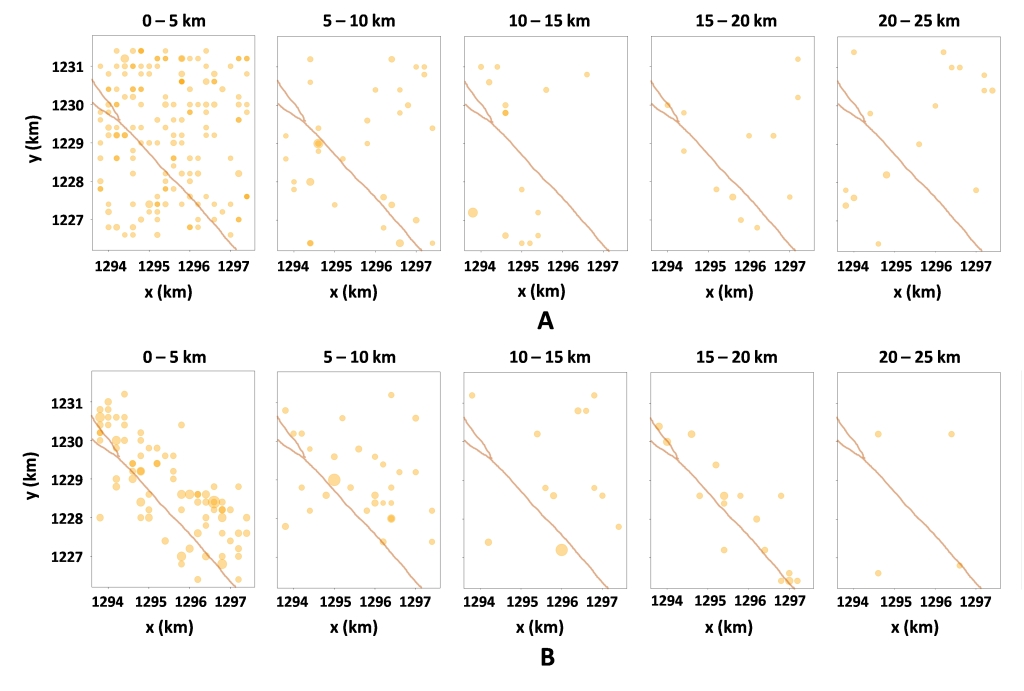 图2 地震定位结果(7天)在不同深度范围的水平切片(Yang et al., 2022)。(A)为原始地震记录定位结果,(B)为去噪数据定位结果。图中每一个圆点代表一个检测到的事件。圆点的大小与反投影成像的振幅超过检测阈值的绝对中位差(median absolute deviation)的倍数成正比