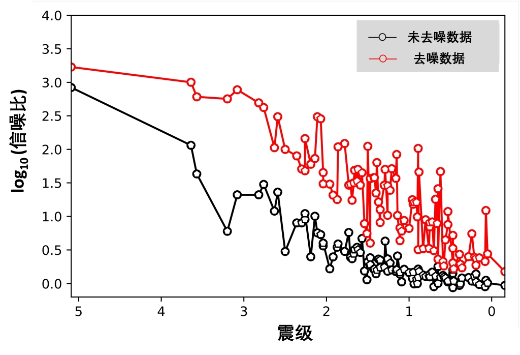图4 地震记录去噪前后信噪比对比图。应用UrbanDenoiser对南加州CI.FUL台站记录到的102条地震记录进行去噪,去噪后的地震记录的信噪比得到显著提高。震级范围为-0.16~5.1(Yang et al., 2022)