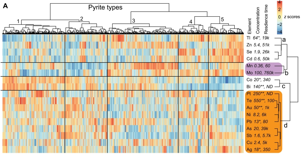 图2 基于微量元素的黄铁矿聚类分析和元素组合(Emmings et al., 2022)