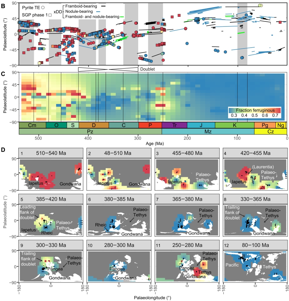 黄铁矿是海洋还原环境中最常见的矿物,文献中广泛记录的黄铁矿的形态参数与地化信息是反映盆地氧化还原条件的重要指标。这些散落在文献中非结构化的“暗数据”,被Emmings等(2022,Science Advances)利用机器阅读(machine-reading)技术挖掘出来,利用于从全球和整个地史的宏观视角俯瞰海洋缺氧历史。