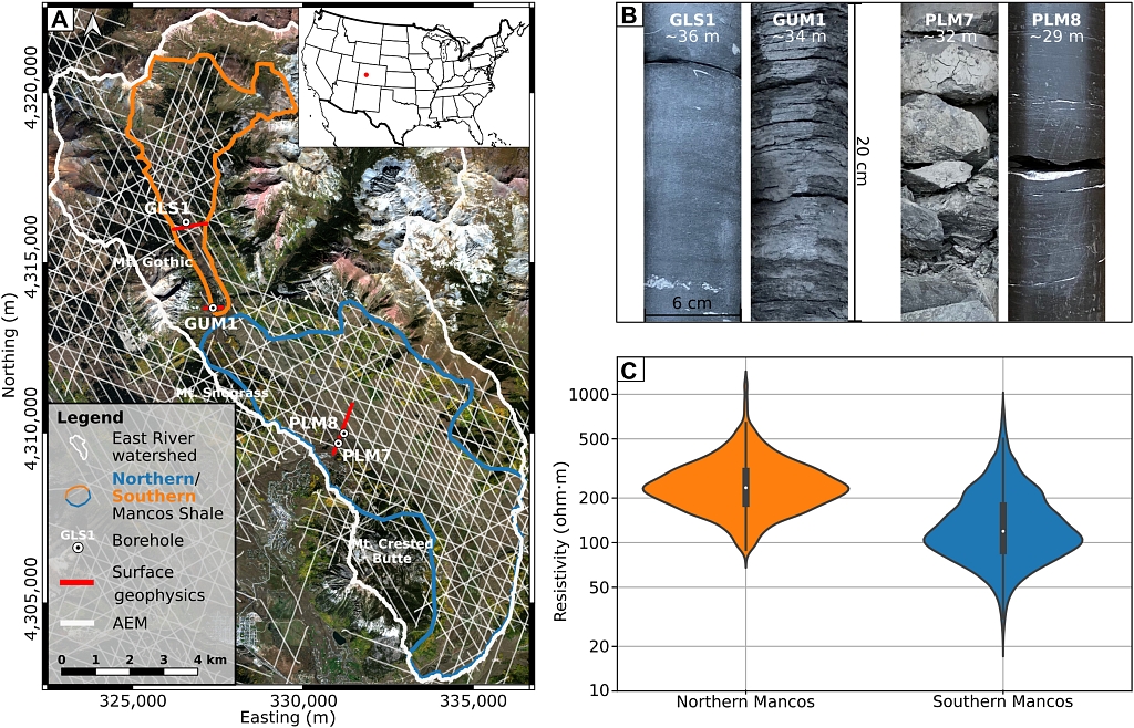 图1 研究区域数据清单与大尺度特征(Uhlemann et al., 2022)。在航拍照片(a)上显示钻孔位置、地表地球物理剖面和航空瞬变电磁飞行线的概览图。图中还显示了东河流域轮廓以及Mancos页岩覆盖的区域。这里未显示由LiDAR数据建构的高程模型及基于高光谱数据的详细植物分类。图(B)为不同钻孔中提取的Mancos页岩岩芯照片,突出了Mancos页岩性质的可变性。图(C)为根据VTEM-ET获得的Mancos页岩在不同分区的电阻率分布