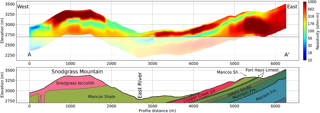 图2 VTEM-ET得到的地下电阻率分布与地质剖面之间的比较(Uhlemann et al., 2022)。图4显示了横截面的位置,该横截面从斯诺格拉斯山以西延伸至流域东端