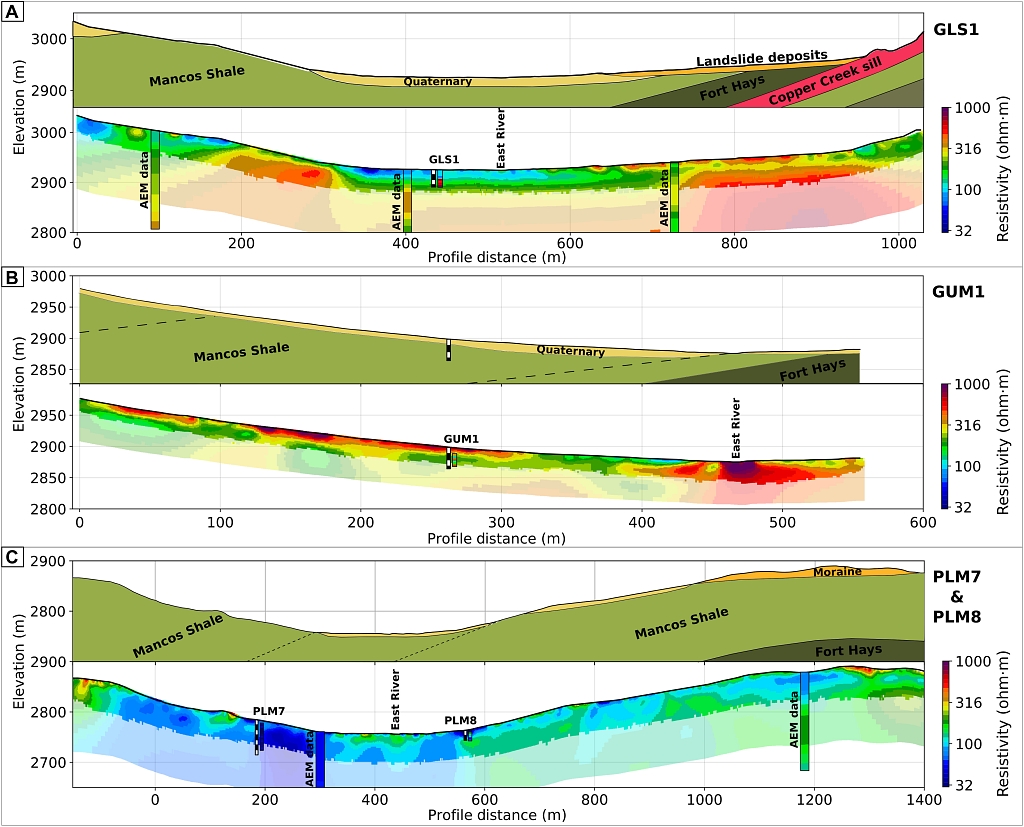 图3 钻孔附近的地质图与电阻率图的一致性复核(Uhlemann et al., 2022)。图A与图B数据采自流域北部,图C数据采自流域南部的数据。对于每个钻孔位置,显示了孔内ERT测量的结果,这些结果也与地面数据一致
