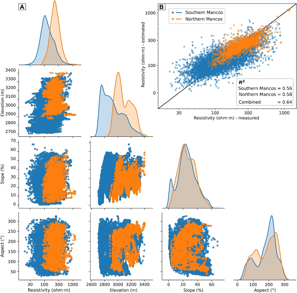 图4 地下电阻率与地貌指数之间的关系分析(Uhlemann et al., 2022)。共提取13524个VTEM-ET测点,对其电阻率与地貌指数(海波、坡度及坡向)的交会图与分布图如图(A)所示。图(B)为采用ERTr获得的估计值与实测值之间的交会图