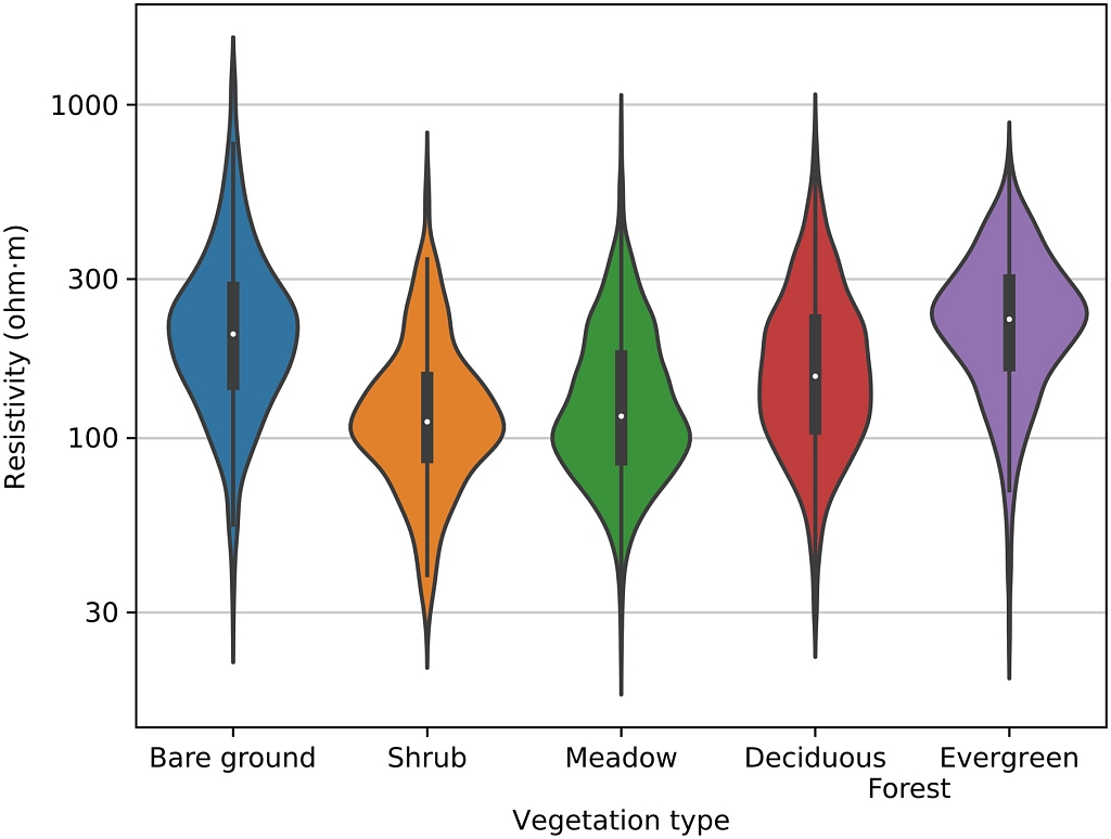 图5 地下电阻率与植被类型之间的关系分析(Uhlemann et al., 2022)。植被类型信息来自高光谱数据