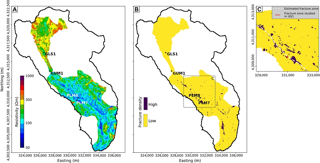 图6 预测浅层地下电阻率和裂缝密度(Uhlemann et al., 2022)。(A)使用ERTr模型预测电阻率,使用地形高程、坡度、坡向和植被类型作为参数。电阻率的变化与观测研究一致,表明流域北部的变质程度较高。(B)裂缝密度是根据使用70 Ωm电阻率的钻孔数据获得的关系定义。假设显示高裂缝密度区域的线性特征对应于裂缝带。(C)先验研究中分析的断裂带区域位于估计的和已知的断裂带沿线