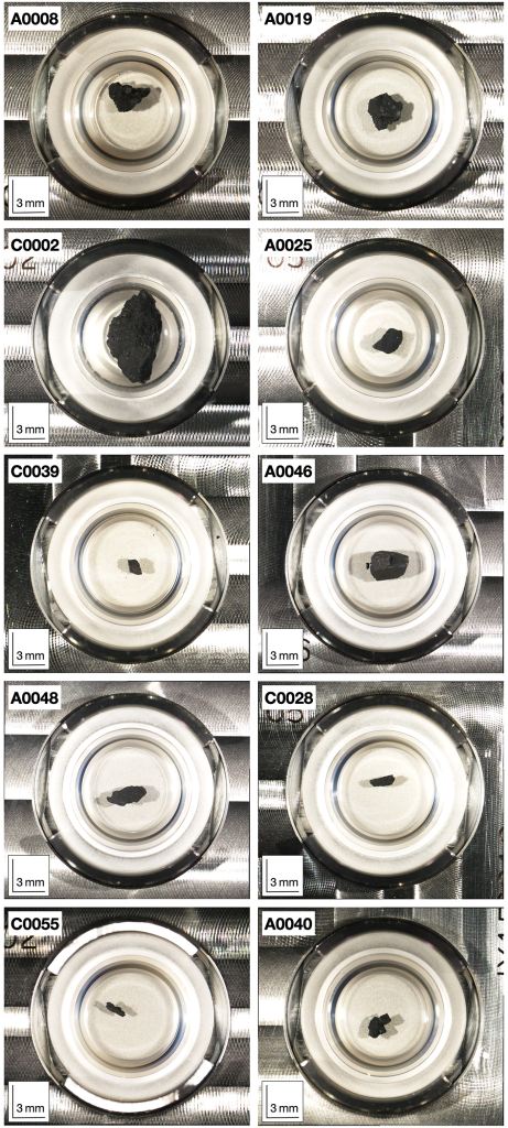 图1 Ryugu小行星返回样品的显微镜照片(Tachibana et al., 2022)。A0008、A0009、A0046、A0048、A0069和A0083来自采样点1(TD1)。C0002、C0004、C0013、C0019、C0028和C0055来自采样点2(TD2)