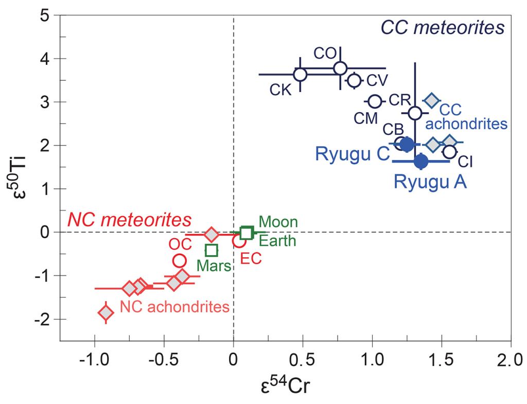 图4 Ryugu返回样品的钛和铬同位素组成与其它陨石样品的对比图(Yokoyama et al., 2022)。CC meteorites:碳质球粒陨石,NC meteorites:非碳质球粒陨石