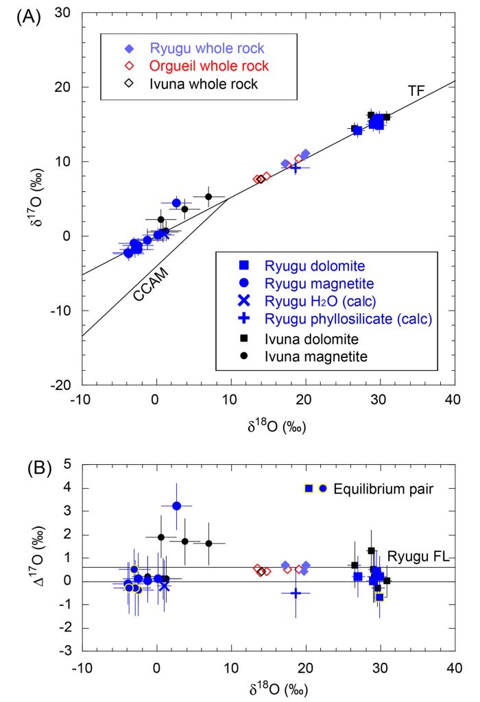 图5 Ryugu返回样品、Ivuna和Orgueil的三氧同位素组成(Yokoyama et al., 2022)