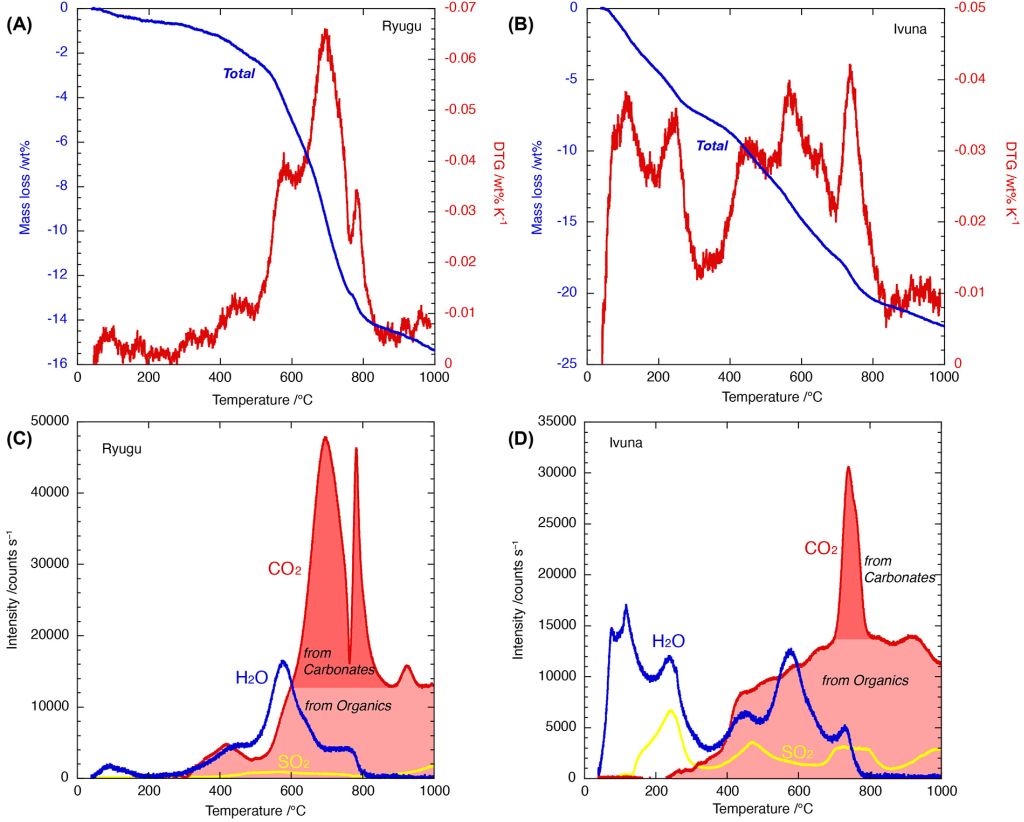 图7 Ryugu返回样品(A)和Ivuna(B)阶段加热质量减少量与温度的频谱图,以及可能的贡献来源(C,Ryugu)和(D,Ivuna)(Yokoyama et al., 2022)
