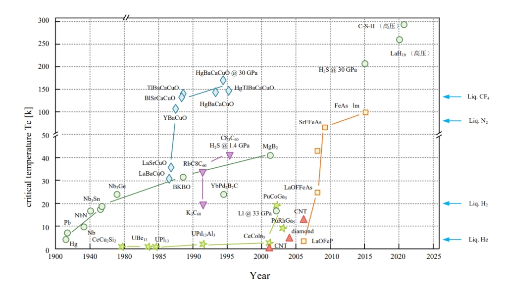1908年,荷兰莱顿大学的Onnes(荷兰)首次实现氦的液化,获得了4.2K(-268.8℃)的低温,1911年,他将金属汞冷却到4.2K时,发现了超导现象。此后经过70多年的努力,超导体的一般临界温度只能提高到23K左右。直到1986年初,物理学家Mueller(德国)和Bednorz(瑞士)发现了高温铜氧化物超导体La2-xBaxCuO4,其临界温度高达40K。1987年2月,美国华裔科学家朱经武和中国科学家赵忠贤相继将钇系材料(YBa2Cu3O7)的超导临界温度提高到90K以上,奇迹般地突破了液氮禁区(77K)。1987年底,Tl-Ba-Ca-Cu-O系材料的临界超导温度记录提高到125K。以上成果均是在高压环境下实现了超导临界温度的提升,因此,施加高压是提高超导临界温度的重要途径,也是探索室温超导的最佳方案之一。截止目前,常压下超导的临界温度记录是134K,于1993年在Hg-Ba-Ca-Cu-O体系材料中获得,其高压临界温度可达165K。以上研究成果中,超导体的形成条件相比“常压、室温”仍存在着巨大的差距(图2)。
