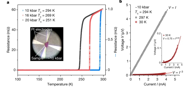 近日美国罗彻斯特大学的Dias团队,宣称他们发现由氢、氮、镥三种元素组成的三元相,在近常压的室温条件下表现出超导性。文中表明这种“神奇”材料由“镥-氢-氮”三种元素构成,给出了可能的材料结构,但并没有介绍具体的制备方法。意味着合成材料仍然存在一定的挑战性,特别是氮元素的加入使得该材料与传统的稀土氢化物截然不同。文中指出,此材料的超导临界温度达到21℃(294K),虽然与我们默认的“室温”300K(约27℃)尚有差距,但基本处于室温水平。更重要的是,其所需的外界压力非常小,被称为“近常压”。为了证明氮掺杂氢化物室温超导性的存在,Dias研究团队分别从样品的电输运、磁化率及比热测量的角度开展了试验研究。
