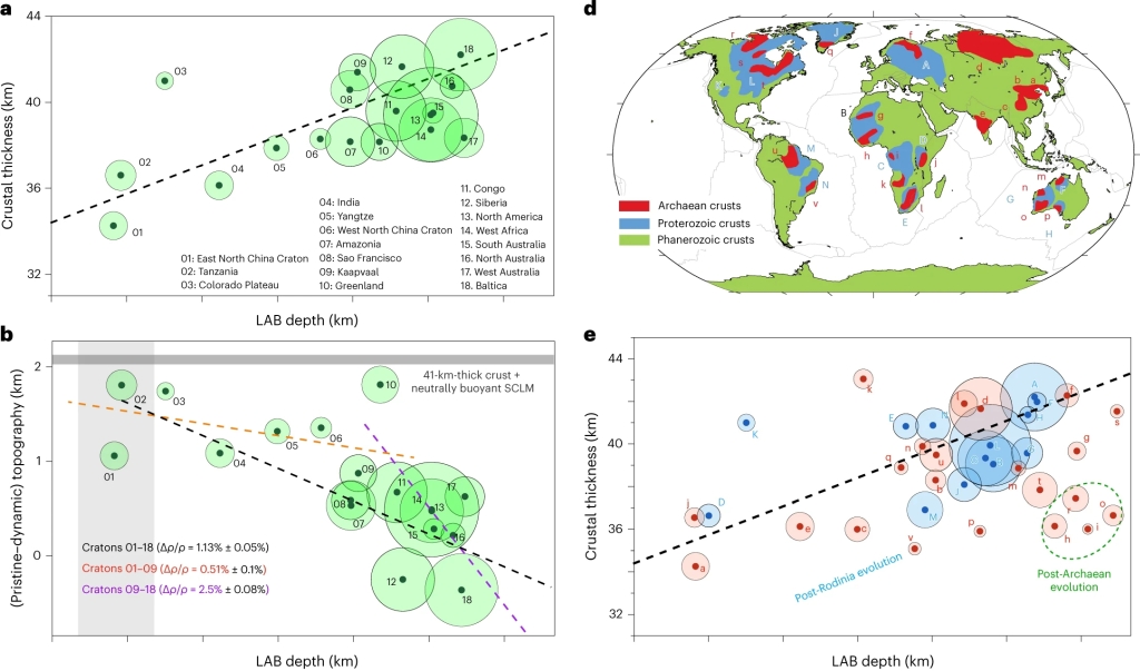 图1 克拉通地形,地壳厚度和岩石圈厚度的关系。(a)地幔岩石圈贡献的地形与LAB(岩石圈-软流圈边界)深度的关系,每个圆圈代表一个克拉通,圆圈面积跟克拉通面积成正比;(b)地壳厚度和岩石圈底部(LAB)深度呈现正相关;(c)不同年龄的大陆地壳的空间分布;(d)不同年龄段的克拉通地壳厚度跟LAB深度的对应关系,结果与b类似(Wang et al., 2023)