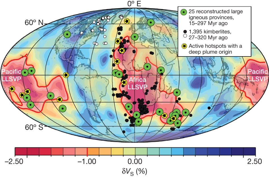 图1 全球大型低剪切波速省 (LLSVPs)、大火成岩省、金伯利岩及与深源地幔柱相关的活跃热点分布。红色实线勾画了非洲和太平洋LLSVPs的轮廓(Torsvik et al., 2010)