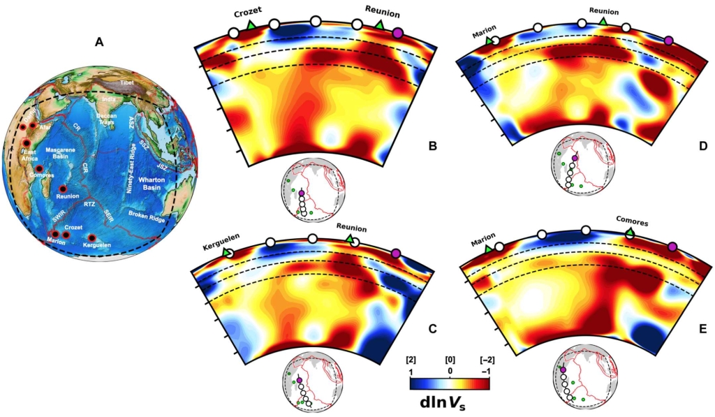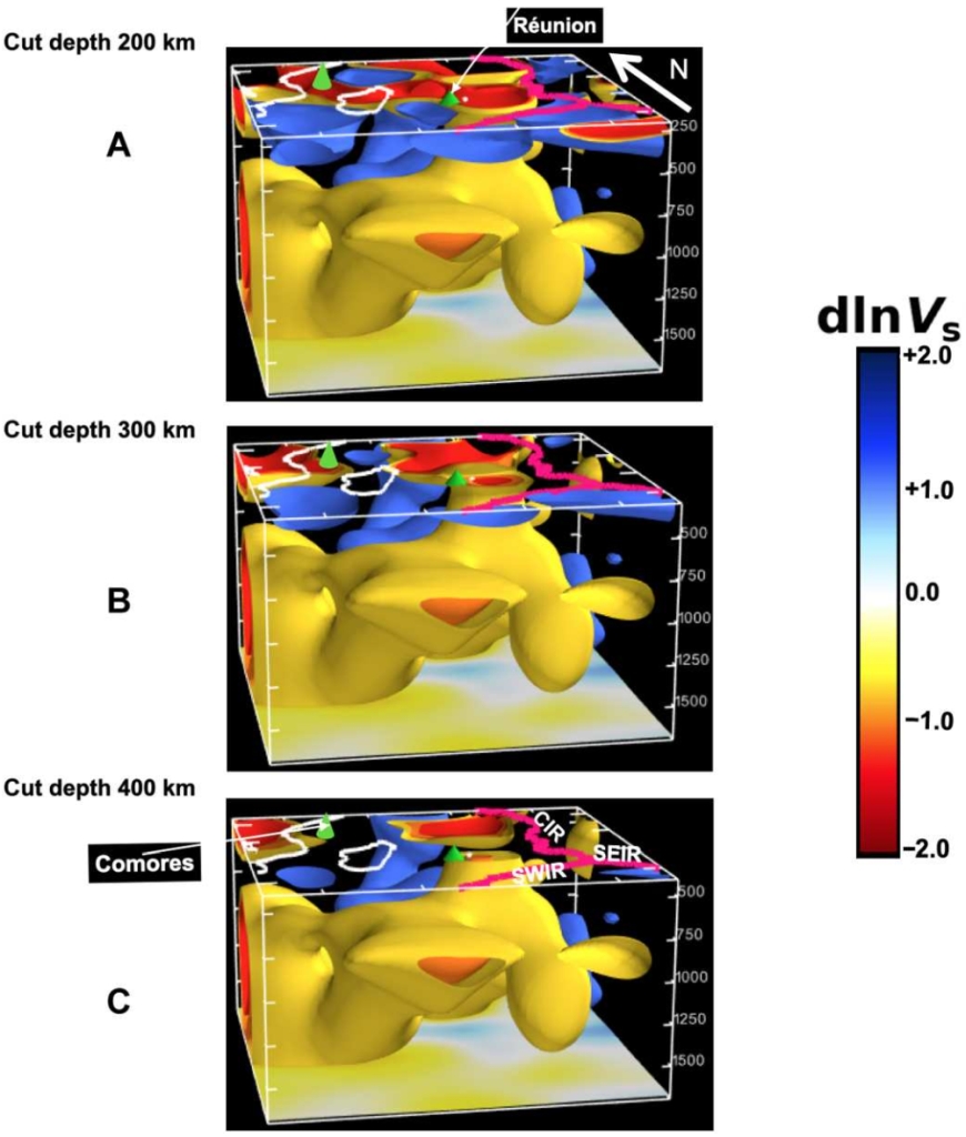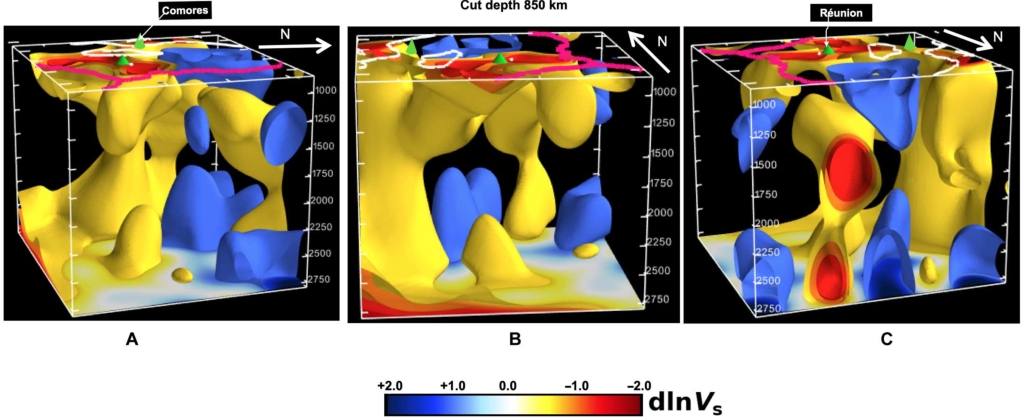 Wamba M D, Montagner J P, Romanowicz B. Imaging deep-mantle plumbing beneath La Réunion and Comores hot spots: Vertical plume conduits and horizontal ponding zones[J]. Science Advances, 2023, 9(4): eade3723.(原文链接)