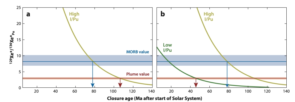 图1 不同地幔Xe丢失关闭年龄与初始I/Pu比对于Xe同位素的影响。蓝色横线和红色横线为观测的MORB地幔和plume地幔的129Xe*/136Xe*Pu值。(a)假设MORB地幔和plume地幔的初始I/Pu比相同,只有当MORB地幔的Xe丢失封闭年龄早于plume地幔,才能解释地幔间的129Xe*/136Xe*Pu值差异。而MORB地幔有更早的Xe丢失封闭年龄在物理上是不合逻辑的;(b)当plume地幔的初始I/Pu比低于上地幔时,MORB地幔的Xe丢失封闭年龄可以晚于plume地幔而得到观测到的地幔间的129Xe*/136Xe*Pu值差异。考虑到I和Pu的半衰期时间和地球早期形成演化的主要事件的时间尺度,该初始I/Pu差异是由于地球吸积生长过程造成的(Mukhopadhyay and Parai, 2019)