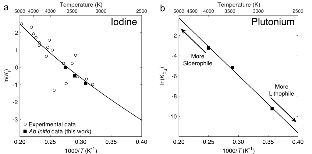 为解决I和Pu在硅酸盐溶液和液态铁之间的配分这一关键科学问题,加州理工学院联合中国科学院大学、巴黎地球物理学院和加州大学戴维斯分校等研究机构,采用两相法第一性原理分子动力学方法 (Zhang and Yin, 2012)得到了这两种元素在高温高压下的配分数据,该方法在之前成功且准确地预测了N、C、Mg、Si、O等元素在高温高压下的配分。他们通过该方法得到的I的配分数据与之前的LH-DAC数据充分吻合(图2.a),Pu在高温高压下的配分数据则是第一次报道(图2.b)。新的数据显示,随着平衡温度的提高,Pu的亲石性会逐渐减弱,这一现象与LH-DAC观测到的与Pu同为锕系元素的Th和U的性质相吻合。