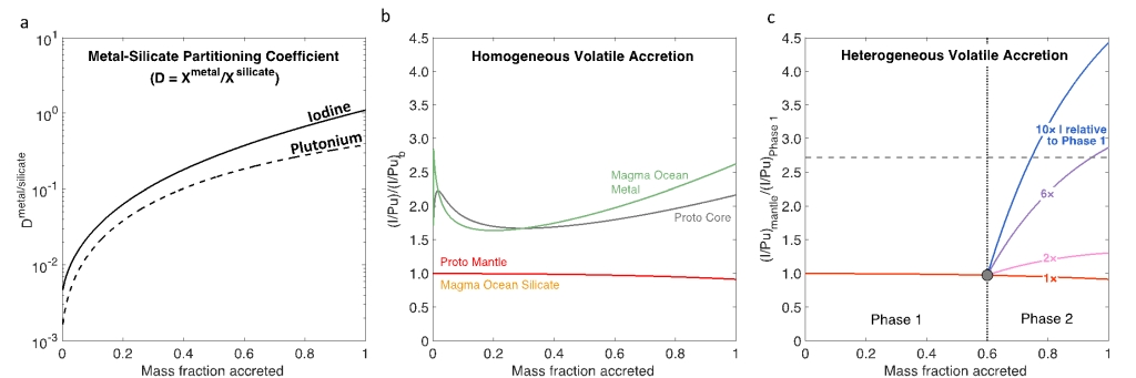 利用新得到的I和Pu的配分,他们进一步建立数值模型模拟了地核形成过程对于地幔I/Pu值的影响。由于在地核形成过程中I和Pu都会在更高的温度和压力下从硅酸盐岩浆洋进入到由液态金属构成的原始地核中(图3a),因此在地球吸积物质的挥发性均一的条件下(图3b),所有过去提出的合理的地核形成模型都无法有效地造成足够的I/Pu比差异以解释深部地幔的低129Xe*/136Xe*Pu值。所以,必须考虑地球形成过程中吸积物质挥发性的前后差异。地幔中的中度挥发性亲石元素揭示了地球早期(Phase 1)相较于晚期(Phase 2)的吸积物质缺乏挥发性元素,即可能有更低的I/Pu比。在这种情况下(图3c),地幔在吸积过程结束之后的I/Pu比会显著高于富挥发性吸积物质加入之前的原始地幔(Phase 2开始前)。如果部分原始地幔没有受到后续富挥发性吸积物质的影响而被一直保存在核幔边界,这部分未受影响的原始地幔将导致今天的深部地幔储库有着低的129Xe*/136Xe*Pu值。