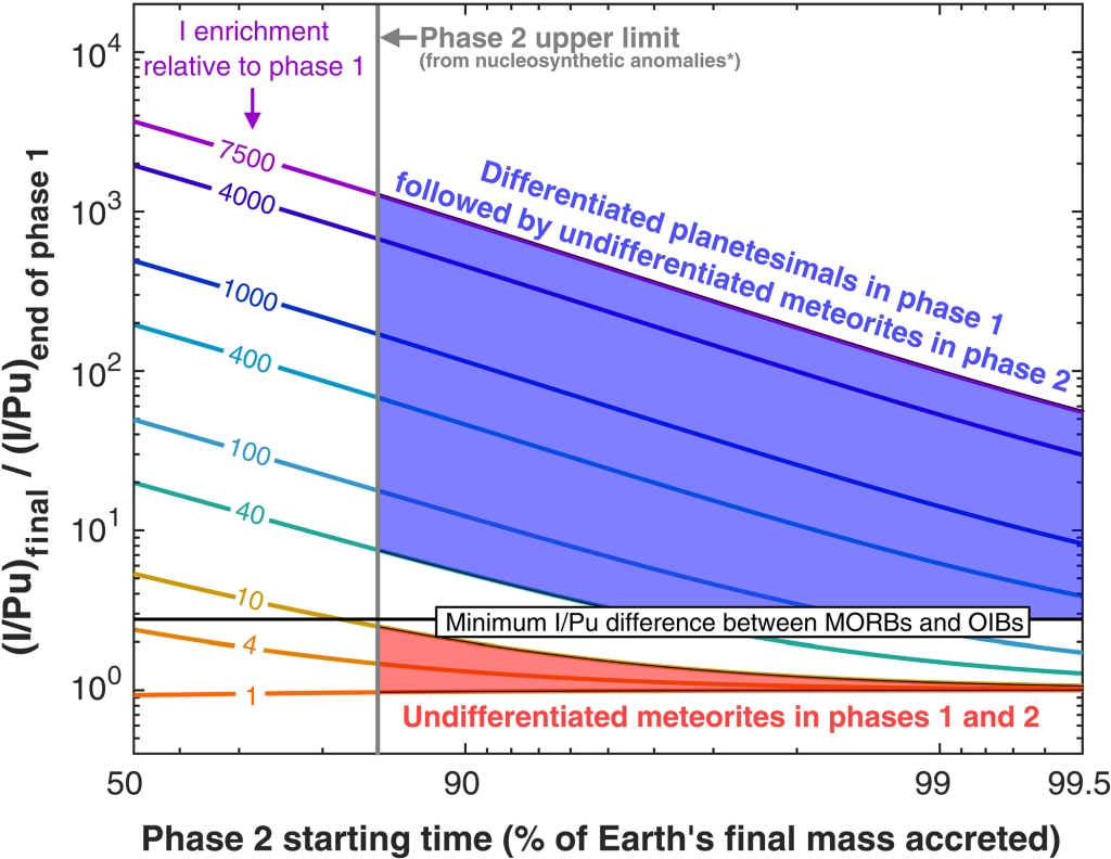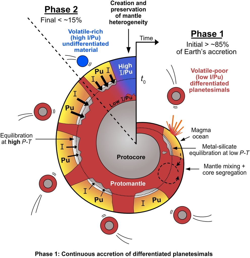 H、C、N、O、I 等挥发性元素是探索生命起缘和地球宜居性的重要元素,但在地球形成(<30-100百万年)过程中,挥发性元素的来源一直是科学家们热议的话题。氙(Xe)同位素是研究这一问题的重要工具。由于129Xe可以由易挥发的半衰期为15.7 百万年的灭绝核素129I通过β衰变而成, 136Xe可以由不易挥发的半衰期为80 百万年的灭绝核素244Pu通过裂变生成,129Xe*/136Xe*Pu只记录了太阳系早期的I/Pu比,与储库的Xe丢失封闭年龄相关,而与后续的历史演化无关。因此,不同地幔储库中的129Xe*/136Xe*Pu同位素差异可以被用来研究地球极早期的形成演化历史。最新的高精度Xe同位素测量分析显示,相较于代表上地幔的洋中脊玄武岩储库(以下简称MORB地幔),来源于地球深部的核幔边界的洋岛玄武岩储库(以下简称plume地幔)有着更低的129Xe*/136Xe*Pu值(Mukhopadhyay, 2012)。考虑到地球的挥发性元素丢失和释气过程应发生在地球表面,深部地幔很难在上地幔停止Xe丢失后依旧持续地释放Xe,因此plume地幔的低129Xe*/136Xe*Pu特征的形成反映了深部地幔在地球吸积生长结束后的初始I/Pu值明显低于上地幔(图一)。