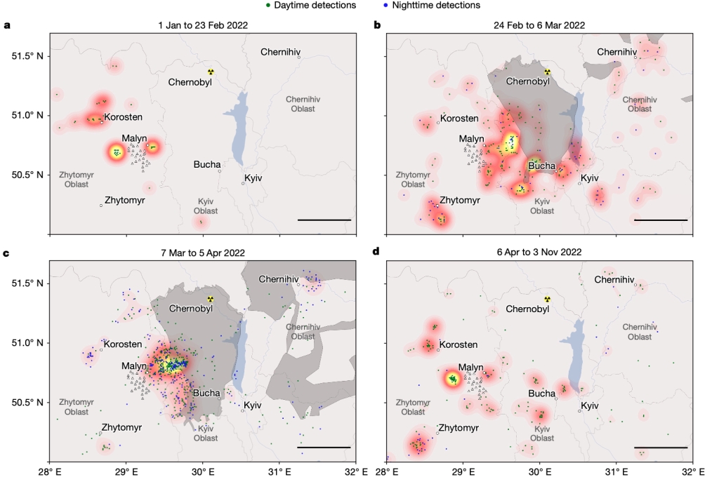 图3 不同时间段的地震自动探测密度图 (Dando et al., 2023)。日间和夜间爆炸分别用绿色和蓝色圆点表示。白色三角形表示Malyn地震阵列的位置。(a) 2022年1月1日至2月23日冲突爆发之前的阶段,最大事件密度为0.09 km-2;(b) 2022年2月24日至3月6日,最大事件密度为0.11 km-2; (c) 2022年3月7日至4月5日激烈战斗期间,最大事件密度为0.73 km-2; (d) 2022年4月6日至11月3日,最大事件密度为0.25 km-2。灰色阴影区域表示俄罗斯军队实际控制地区。比例尺为50 km