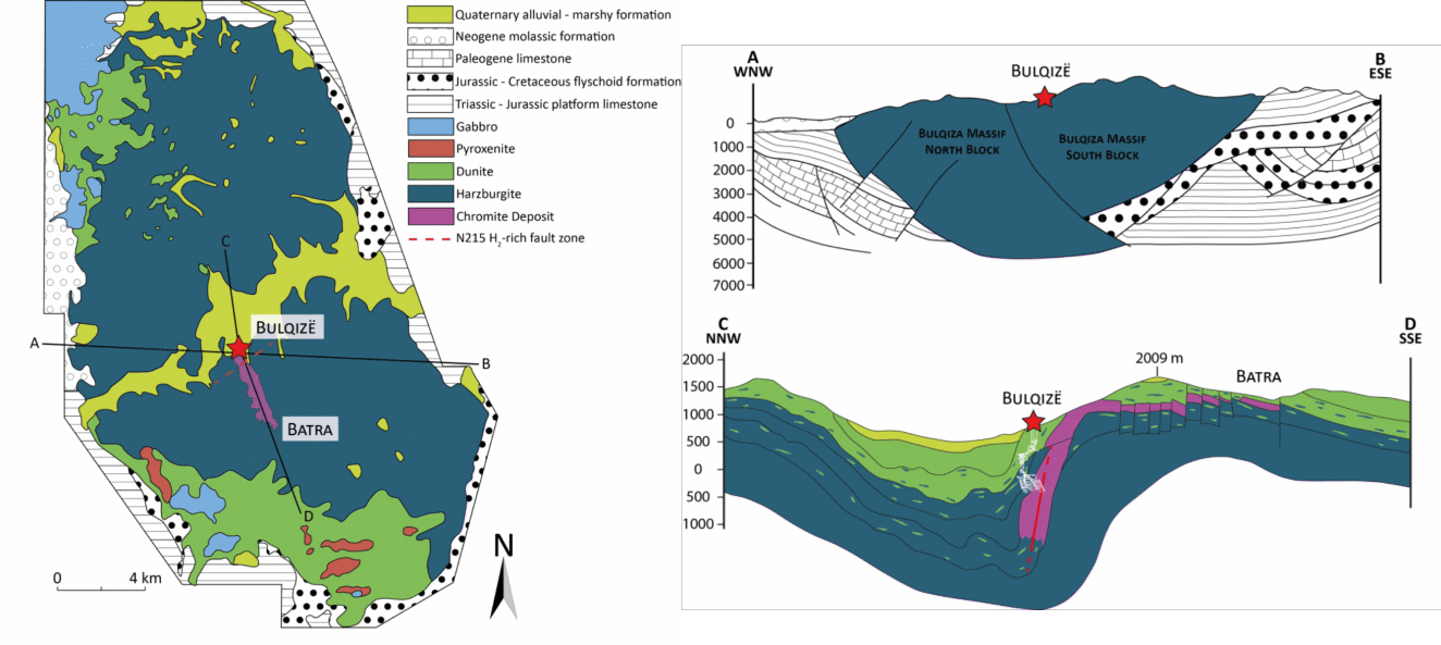 摘要:具有较大可开采储量的地质成因氢气是初级能源的潜在来源,但这一重要储库尚未引起工业领域的足够重视。近期发表在Science的一项研究报道了阿尔巴尼亚布尔奇察(Bulqizë)蛇绿岩伴生的铬铁矿深部矿井中存在迄今记录的最大氢气产率,计算获得的年均氢气排放量高达200吨以上(Truche et al., 2024)。这一氢气的“井喷”现象不能单纯归因于岩石中古流体的释放或当今活跃且普遍的超镁铁质岩石的蛇纹石化作用,而更可能来源于蛇绿岩内部受断裂系统控制的氢气储库。这一发现表明,某些蛇绿岩可能蕴藏着具有经济价值的氢气。