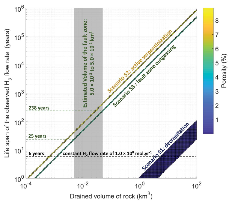 第三种情形中,研究者认为在矿井中观测到的H2流量是产生后储集在断裂带中的H2释放的结果。矿井施工打穿了断裂带的顶部,释放了储存在这个封闭区域(孔隙储集层)内的气体。假设在蛇绿岩断裂带的等效孔隙度具有5%的平均值,断层体积为1.3×10−3 km3,足以维持H2以观测到的流量释放6年。考虑到断层体积的估算范围和假设的相同孔隙度,观测到的流量可以持续25到238年,也即是说,该断裂带中的H2总储量可达5000至50000吨。蛇绿岩深层温度为40 ℃至160 ℃,且比较干燥,这些条件可能阻碍了微生物活动(太热)和非生物氧化还原反应(太冷)对H2的消耗。在地壳中隔离了数十亿年的富H2流体已经在地下矿井和前寒武地盾的钻孔中被发现报道过,证明H2可以在地质时间尺度上积累。