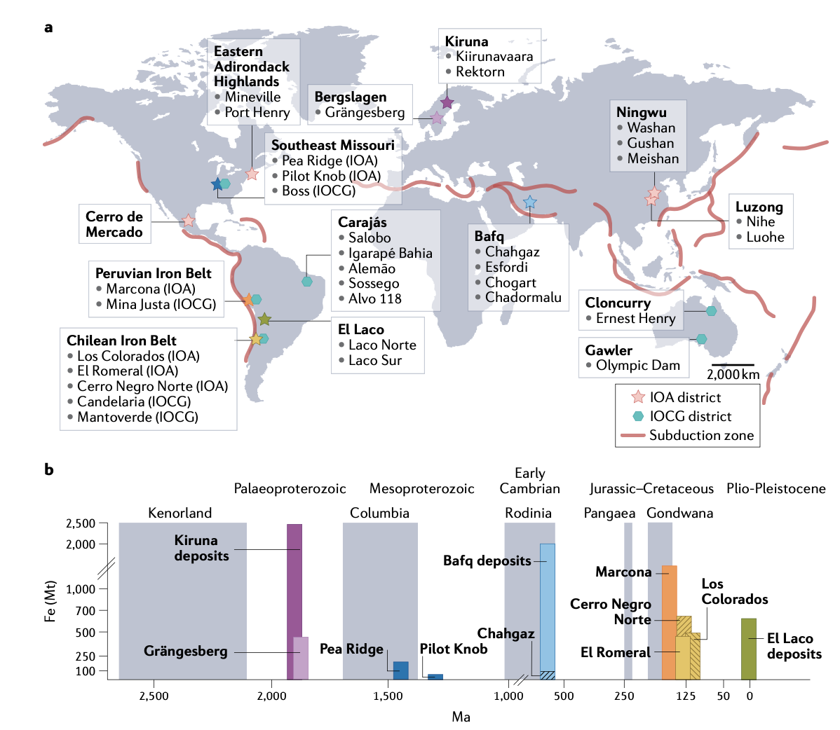 图1 铁氧化物磷灰石矿床(IOA)时空分布 (Reich et al. 2022)。部分区域发育铁氧化物铜金矿床(IOCG)