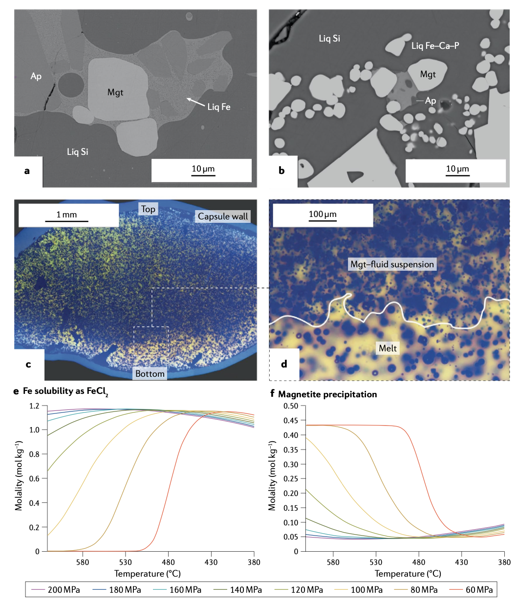 富铁、钙、磷的熔体相(“铁矿浆”)结晶成矿是传统成矿模型,模型中硅酸盐岩浆发生液态不混溶形成“铁矿浆”, “铁矿浆”从硅酸盐熔体中分离并结晶成矿。长期以来,几乎不含硅、且吻合矿石成分的富铁熔体能否形成、如何形成尚无定论。针对此问题,Hou et al. (2018) 开展实验,发现在~1000 ℃, 0.1 GPa, 较高水活度,以及氧化条件下(ΔFMQ + 3.3)条件下,富铁硅酸盐体系能发生不混溶产生SiO2 < 5 wt.%的富铁熔体 (图2a、图2b)。此工作揭示出增加岩浆体系氧逸度和水活度有利于熔体发生不混溶,形成几乎不含Si的“铁矿浆”,极大地完善了“铁矿浆”成矿模型的理论基础。除实验岩石学工作,此模型也受模拟计算和熔岩流构造、富铁熔体包裹体等地质观察的支持 (Keller et al., 2022; Pietruszka et al., 2023)。实验得到的低硅富铁熔体中P2O5可达30 wt.%,可以解释部分矿床中的富磷灰石矿石或磷灰石脉,但高于致密状铁矿石中磷含量。实验岩石学使用封闭体系,并以快速降温结束实验观察产物,较难模拟岩浆去气过程,其中可能涉及S、C、P、H2O、Cl等元素的逃逸。