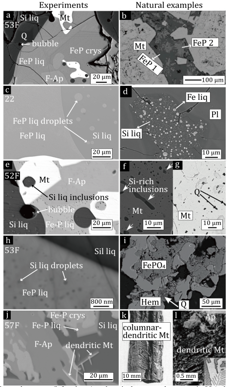 图4 实验与自然矿床中支持岩浆Fe-Si熔体不混溶的结构(Yan et al. 2024), 智利El Laco矿床: b, d, f , i, k; 瑞典Kiruna矿床: l; 智利El Romel矿床: g。a, b 两种FeP相;c, d FeP熔体液滴被硅酸盐熔体包裹; e, f, g 磁铁矿中富Si或石英包裹体; h, i FeP物质中富Si熔体包裹体或石英; j, k, l 树枝状磁铁矿。FeP/Si liq 铁磷/硅酸盐熔体; bubble 液泡; Q 石英; Mt 磁铁矿; crys 晶体