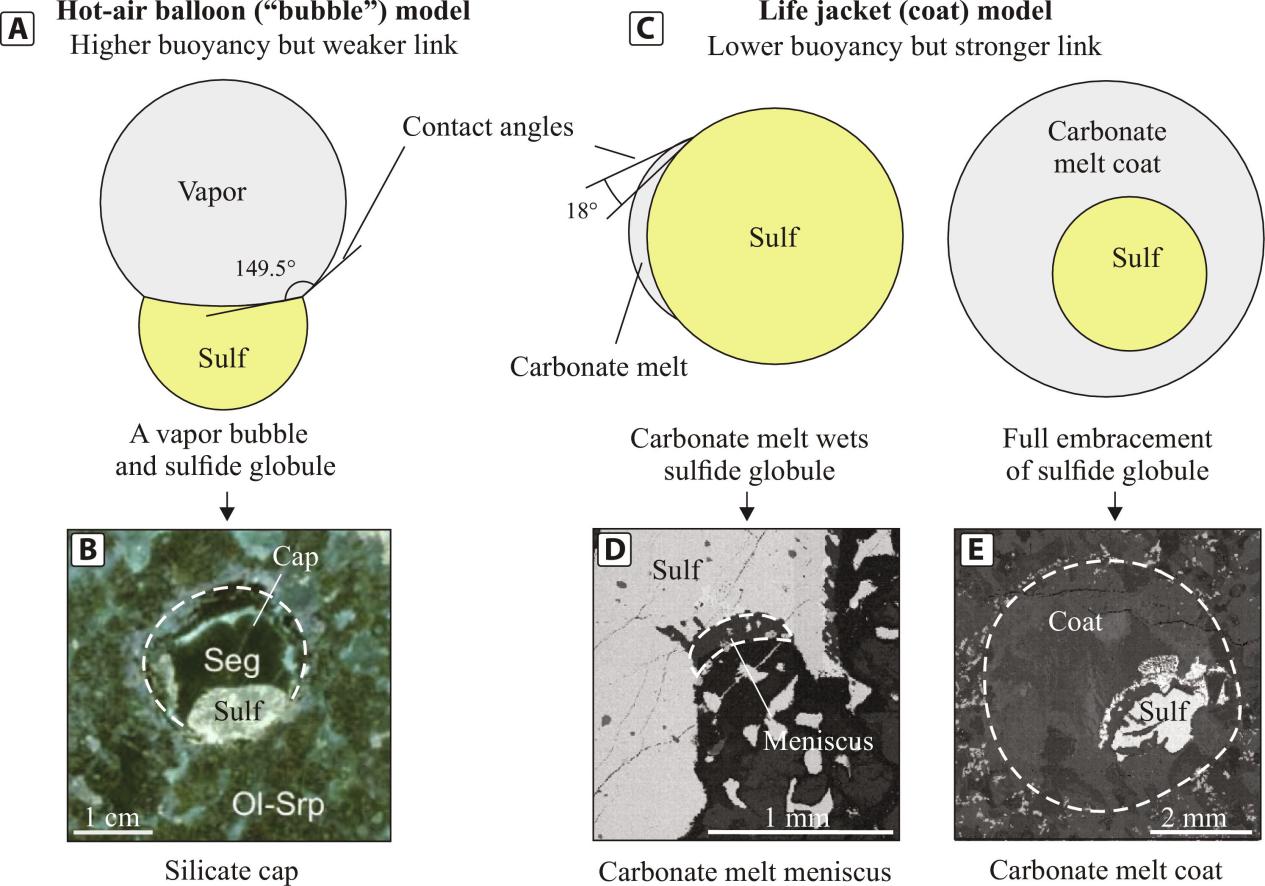 硫化物与碳酸盐矿物(如方解石)共生的现象在天然样品中非常常见,研究发现,硫化物熔体在挥发物气泡的包裹下形成了复合液滴,这些液滴通过浮力作用迁移至岩浆系统的浅部区域,最终沉积形成矿床。
