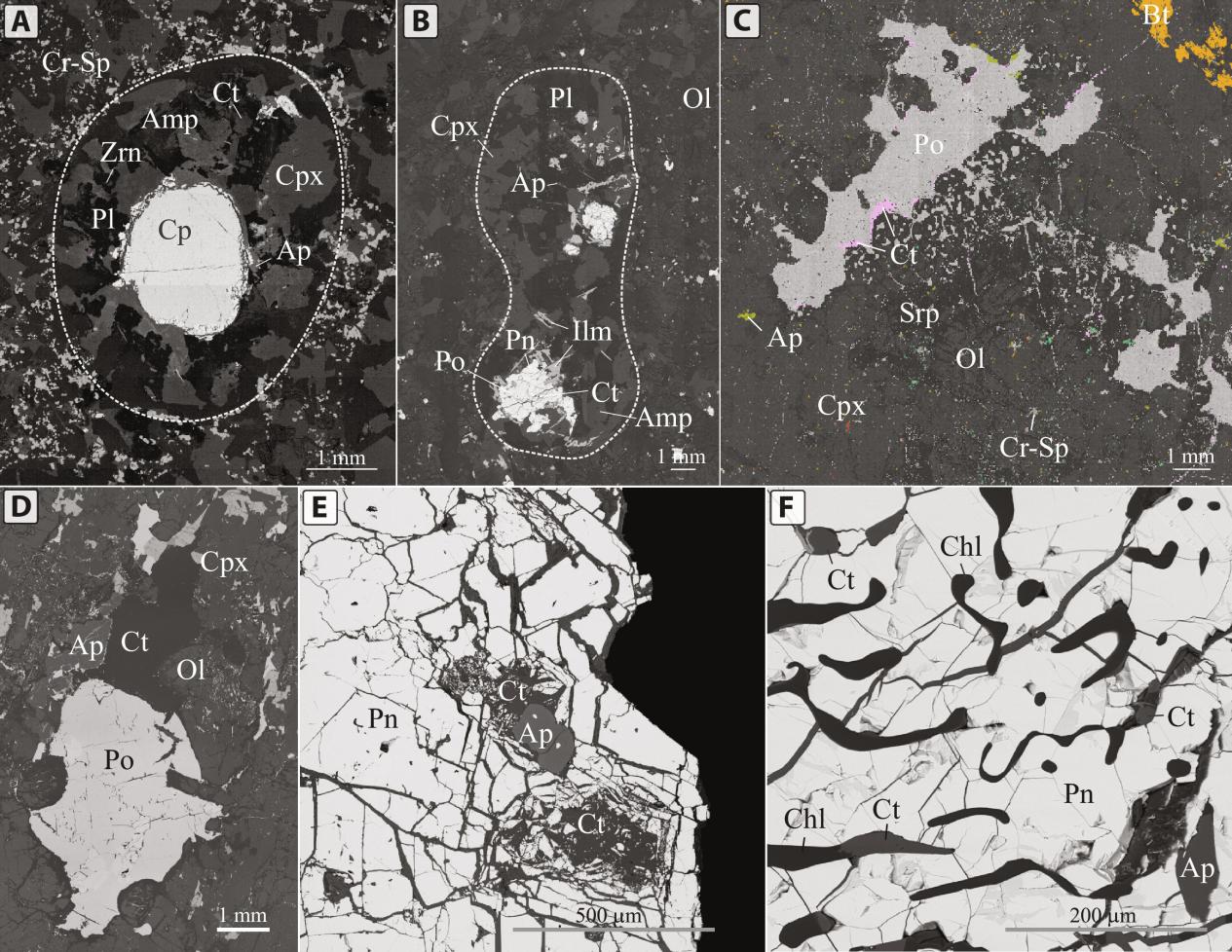图3 富挥发物相有关的硫化物珠滴的背散射电子图像(据Cherdantseva et al., 2024)。图A、B展示了两个球状体的组合,中间是硫化物球状体,周围是挥发分和不相容元素富集的球状体组合。图A是俄罗斯Norilsk矿床1号岩体中被富挥发分晕包围的硫化物珠滴,图B、E来自蒙古Rudniy岩体,B为大的细长晕,E为硫化物珠滴包裹不规则的碳酸盐和磷灰石,图C、D来自意大利Valmaggia岩筒,C为硫化物的方解石边,同时被挥发分相和不相容元素富集相包围;D为方解石和磷灰石吸附在小硫化物珠滴周围;图F硫化物珠滴包含蠕虫状磷灰石和方解石包裹体