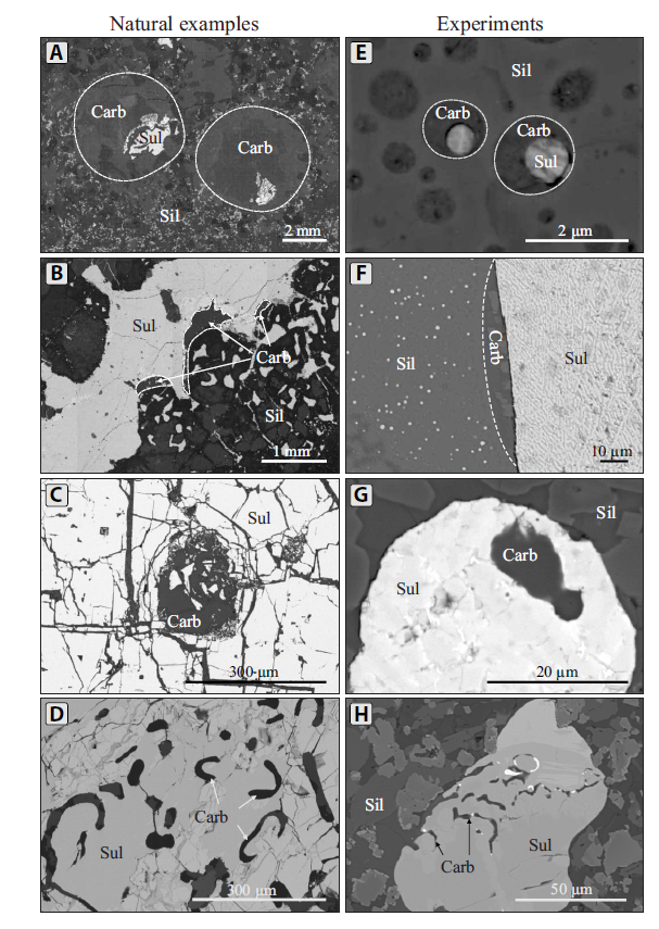 图5 碳酸盐熔体加入硅酸盐体系实验阶段性产物的显微照片,碳酸盐呈救生衣状包裹在硫化物外围,或与硫化物紧密伴生(据Cherdantseva et al., 2024)