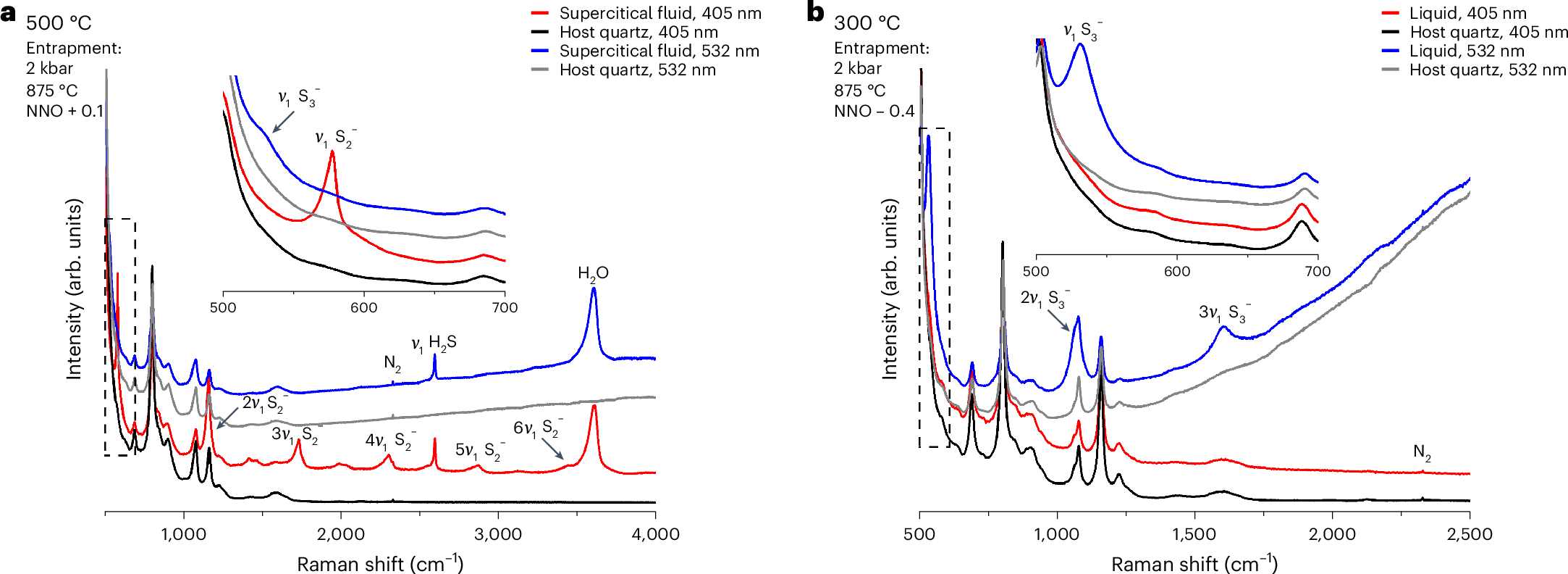 为了攻克这一难题,Farsang and Zajacz(2025)创新性地采用了原型高压容器装置,结合原位拉曼光谱技术,从而能够在一系列与自然界相似的压力–温度–氧化还原条件下,对实验流体中的硫形态进行精准的原位测定。实验流体的组分与钙碱性弧岩浆作用相关的岩浆流体组分相当,主要为水、氯化钠与硫酸,旨在最大程度还原弧岩浆流体。在实验过程中,通过更新实验设备以达到对氧化还原条件的精确控制,将流体以合成流体包裹体(SFI)的形式成功捕获,随后利用拉曼光谱技术在不同的实验条件下对这些包裹体进行原位测定。该研究主要获得了以下认识: