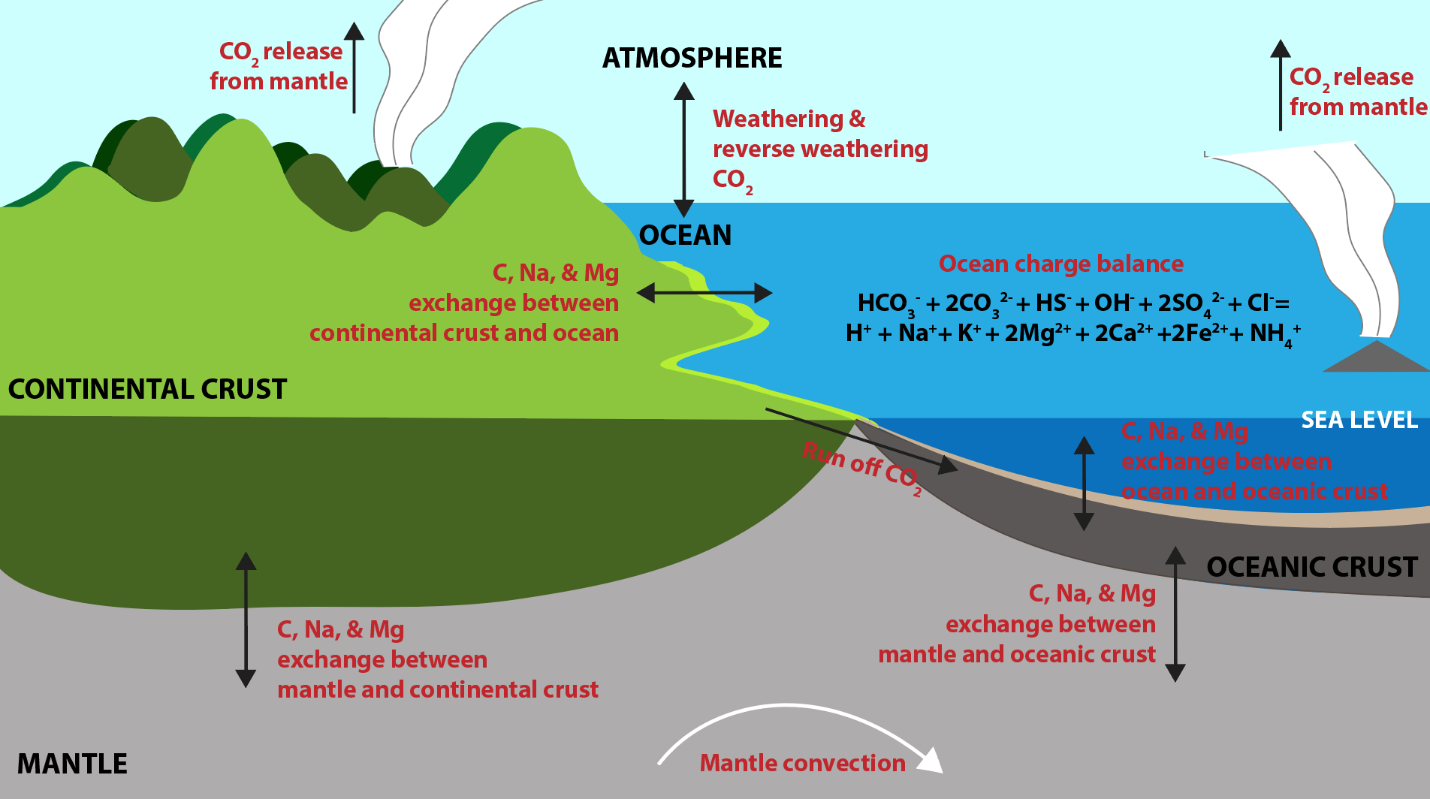 针对这些问题,南洋理工大学与耶鲁大学的研究者合作开发了一个新的模型,将全球碳循环与海洋地球化学相结合(图 1),并以固体地球系统的演化为约束。该模型引入了两个创新点。首先,该模型通过海洋电荷平衡显式追踪大气 pCO₂ 和海洋 pH 的变化,并结合大陆形成史(Guo and Korenaga, 2020)及地幔热演化(Guo and Korenaga, 2023),自洽地约束全球碳和海洋中主要阳离子的地球化学循环。它是首个系统地考虑了大陆形成和地幔热演化对碳、钠和镁循环的影响的模型,并将其贯穿整个地球历史的模型。此外,他们引入大陆浮力模型的计算结果(Korenaga et al., 2017),考虑了海水总质量的演化对海洋 pH 的影响,而这在以往海洋 pH 研究中尚未涉及。