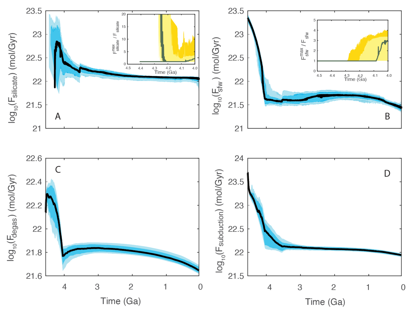 通过定量分析地幔脱气、地壳形成、俯冲作用及化学风化过程中碳的交换,该模型重建了地球各储库中碳的存储历史,并评估了早期地球如何从岩浆海固化后富 CO₂ 的初始大气(Abe, 1993)演化为宜居环境的物理机制(Catling and Zahnle, 2020)。他们的主要发现如下: