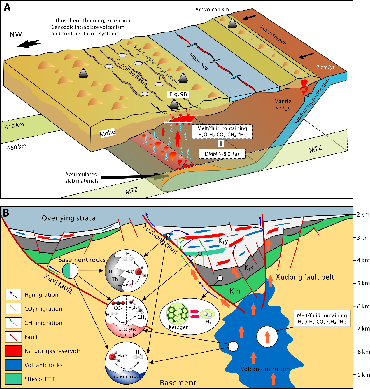 图3 松辽盆地庆深气田天然氢气形成与富集模式。(A)在板块俯冲作用下,携带挥发分的深部富氢流体进入地壳浅层并释放非生物成因气体。NW,西北;MTZ,地幔过渡带;DMM,亏损上地幔;(B)沉积盆地和基底岩石通过水岩反应、水辐射分解、有机质分解及费托地质合成反应生成和消耗氢气