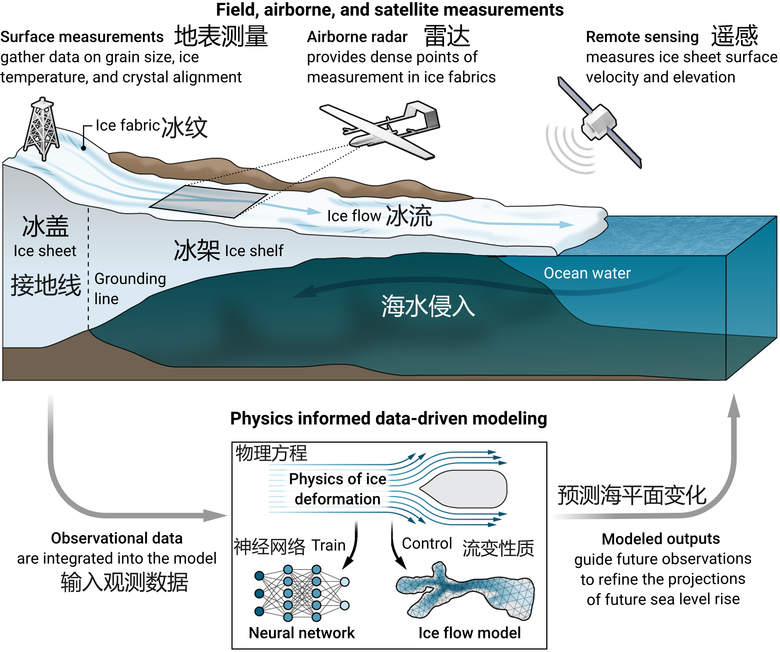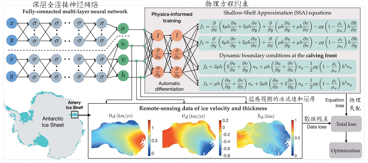 图1 数据模型驱动的冰架流变性质研究。(西)南极冰盖主体位于海平面以下,容易受到海水的侵入造成冰架的垮塌,进而加速冰盖的流失。现有的冰盖流动定律,不足以精细描述冰盖的复杂流变过程,借助物理约束的神经网络和遥感观测数据可以反演出南极地区冰架的流变特征,并将其用于预测未来海平面变化