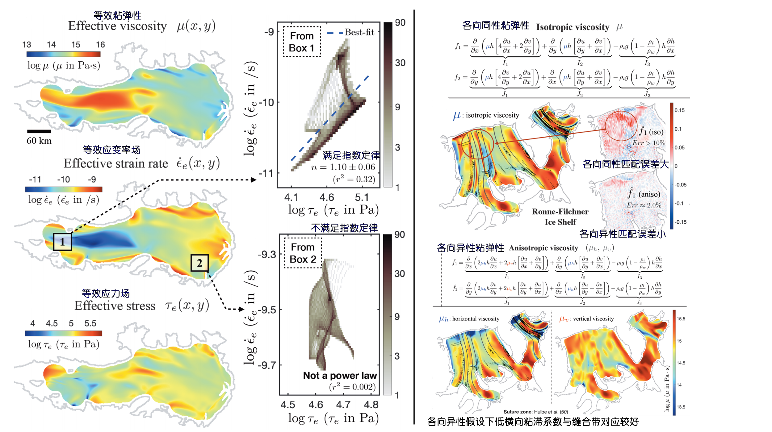 图3 反演得到的等效粘滞系数、应力-应变率关系以及各向异性粘滞系数。应力-应变率关系受到应力场的影响,在不同的冰架区域具有不同的应力指数及各向异性。粘滞系数在冰体拉伸区表现出显著的各向异性,由此反演得到的横向粘滞系数低值与其他方法划分的冰架缝合带,较各向同性假设有更好的对应关系