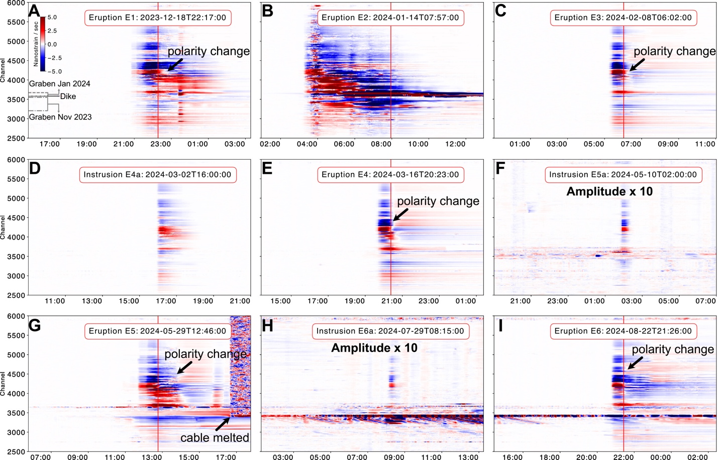 图2 九次岩浆侵位事件的12小时应变率观测记录。图A中标出光缆与岩脉相对位置,红线为喷发时间,黑色箭头表示喷发后快速出现的极性变化