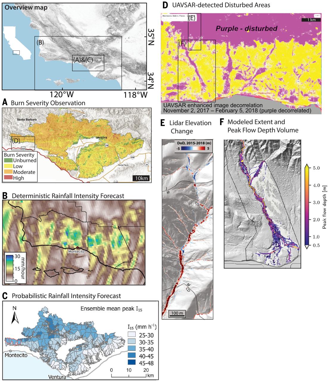 图1 2017年托马斯大火和随后发生在南加州的泥石流。(A)火灾严重程度图(Addison et al., 2020);(B)最大1小时降雨强度的确定性分布图(Dowell et al., 2022);(C)基于WRF模型(Weather Research and Forecasting Model)的概率性降雨强度预报图(Czuba et al., 2014);(D)无人机合成孔径雷达(UAVSAR)探测数据(Donnellan et al., 2018);(E)基于2015年(火灾前)和2018年(泥石流后)数据集的1米分辨率激光雷达(LIDAR)衍生的地表高程变化估算值(Morell et al., 2021);(F)泥石流淹没模型(Barnhart et al., 2021)
