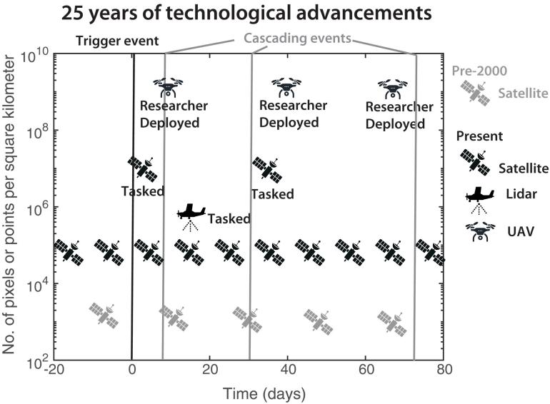 为了攻克“级联地表灾害中频率-规模关系动态变化”这一难题,需同步丰富和完善观测数据集(图 1)。然而,当前鲜有研究能够深入追踪级联地表灾害在较长时段、更高分辨率下的演变轨迹,并解析灾害事件与多年前触发事件之间的潜在联系。随着新一代遥感观测技术(新型卫星、雷达、无人机)所提供的高精度数据的广泛应用,研究人员能够获取更高空间分辨率和时间分辨率的影像数据,这使得在灾害事件发生后可以迅速生成高分辨率的地表变化图,并通过重复的影像采集从而捕捉到级联灾害发展过程中的地表动态变化,为深入理解级联地表灾害的演变规律提供有力保障,并为防灾减灾提供支撑(图 2)。