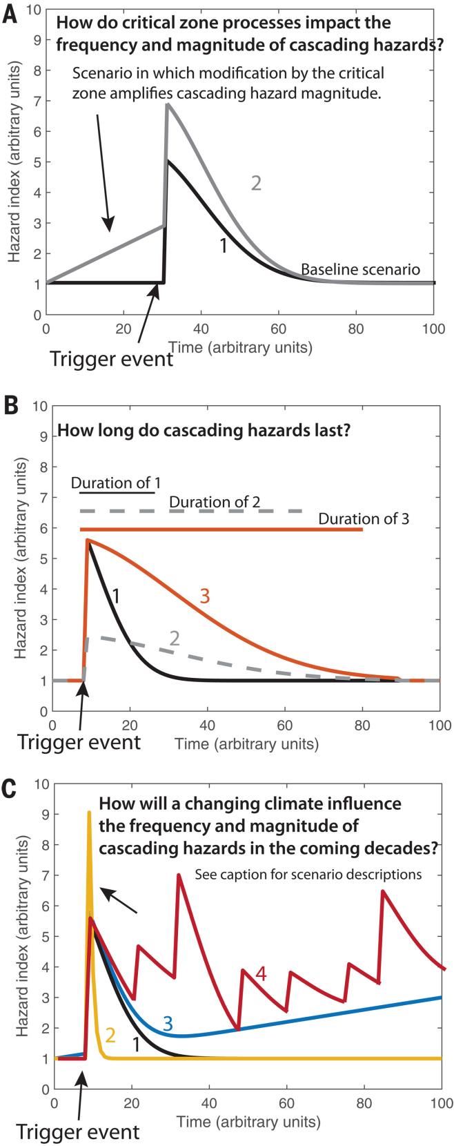 图4 基于灾害指数的概念框架(A)地球系统如何影响级联地表灾害的规模和发生频率?(B)级联地表灾害持续多长时间?(C)未来数十年气候变化如何影响级联地表灾害的规模和发生频率?