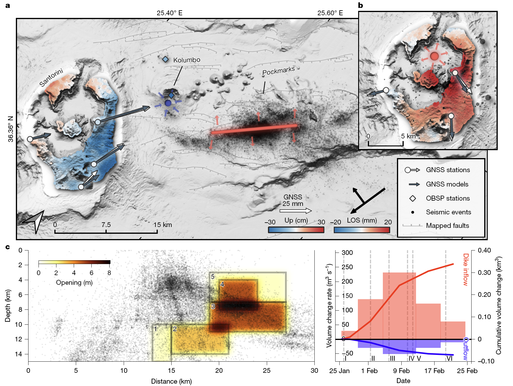 图1 希腊圣托里尼及东部火山-断层带于2025年一月至二月的地震群和地表变形观测。Kolumbo的凹陷伴随断层带的隆升和地震群自西向东的迁移。为了解释断层带的隆升,作者假设了5期次岩墙膨胀。模拟结果显示岩墙膨胀增量是Kolumbo岩浆房收缩量的4倍(Isken et al., 2025)