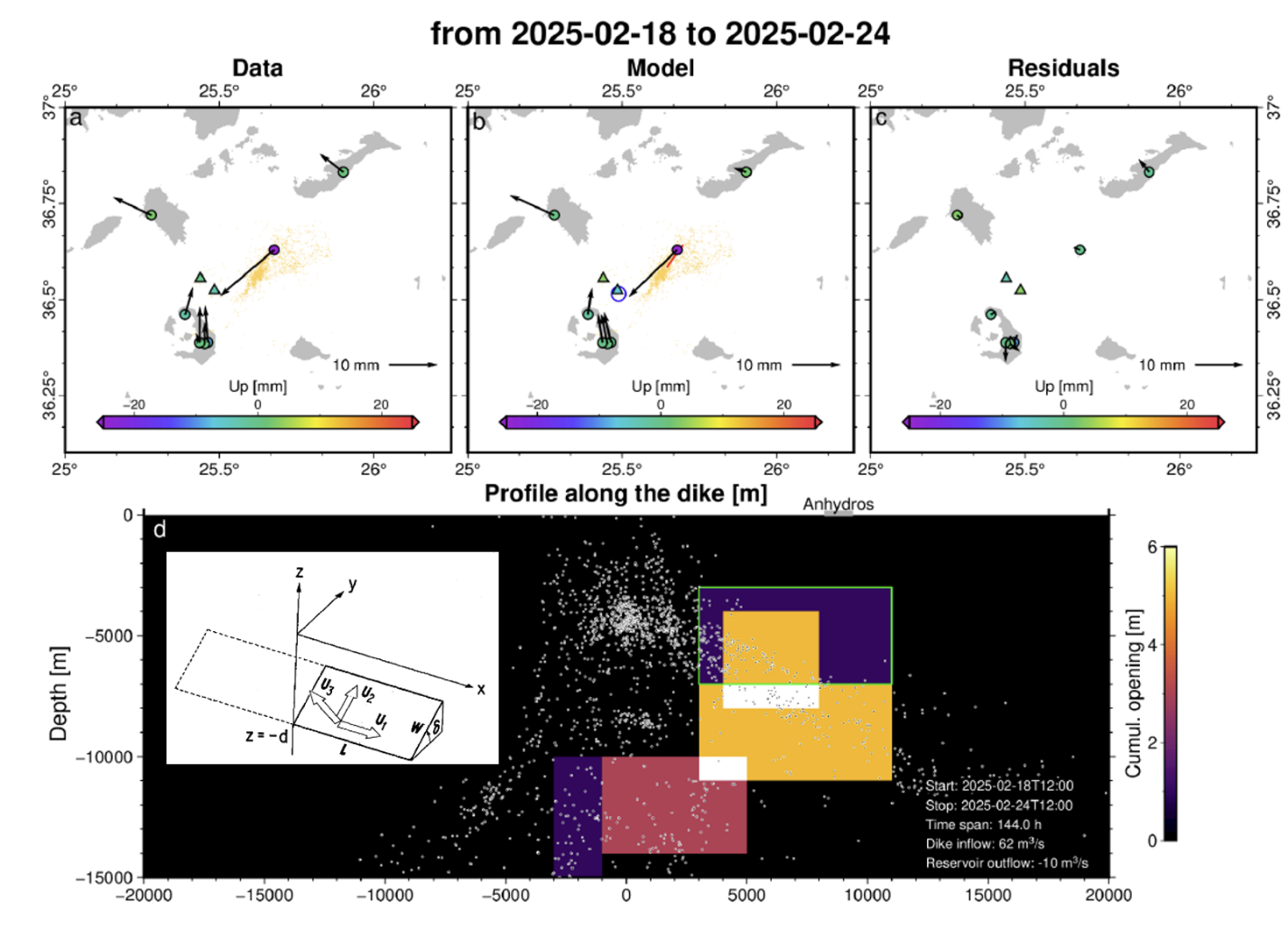 图2 应用断层位错模型(d插图,来自Odaka, 1985)定量模拟岩墙膨胀造成的地表变形。Isken等针对圣托里尼东部的区域构造模式假设5个走向北东、垂直地面的岩墙(上图c)依次活动,成功模拟了地表变形观测(Isken et al., 2025)