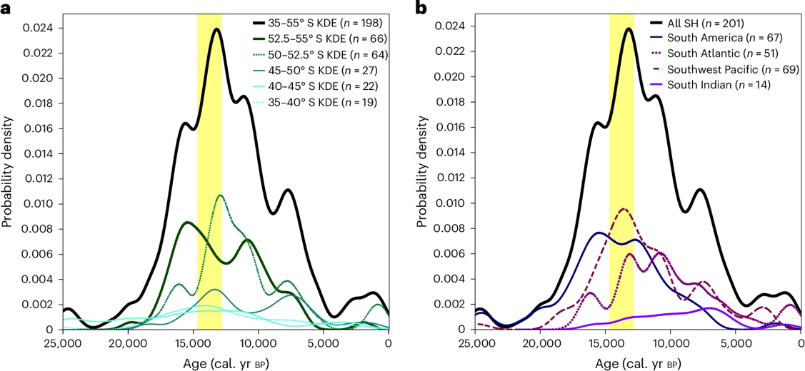 研究团队整合了福克兰群岛最新测年数据及南纬35°以南区域已发表的泥炭测年数据,构建了涵盖201个地点共237个泥炭发育年龄的数据集(图1)。所有样本均经放射性碳十四测年并统一校准,进而采用核密度估计(KDE)建模与累积概率分布分析方法,以识别自末次冰盛期以来南半球中纬地区泥炭的关键发育阶段。
