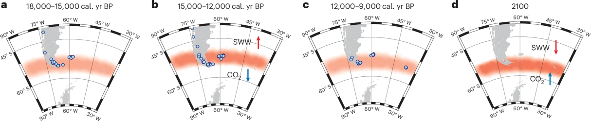 研究重点关注了约14,700–12,800年前发生的 “南极冷逆转”事件。以往因南半球数据稀缺,前人认为该事件的寒冷气候抑制了泥炭的发育,表现为泥炭发育年龄的中断。然而,该研究揭示泥炭发育中断仅局限于最南端的52.5–55° S区域,与这一时期西风带的北移(也就是向赤道方向迁移)有关。与之相反,西风带北移为52.5° 以北地区带来了更为丰沛的降水,从而为泥炭发育创造了有利的水文条件。西风带的北移与当时全球CO2浓度上升速率的减缓同时发生。