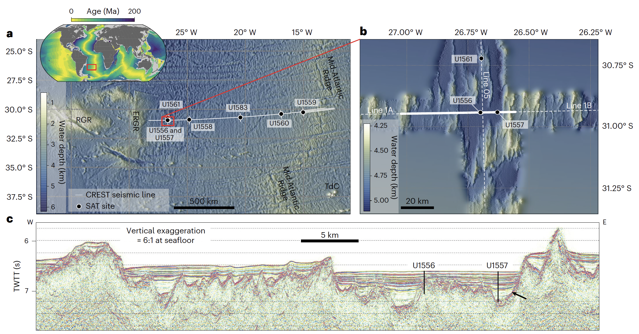 图1 IODP横穿南大西洋航次钻孔位置及地震反射剖面